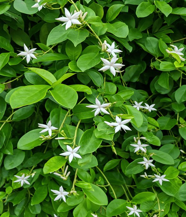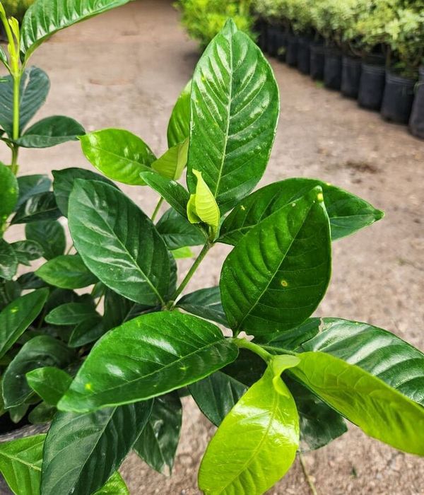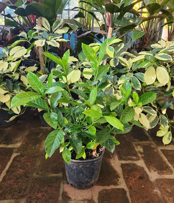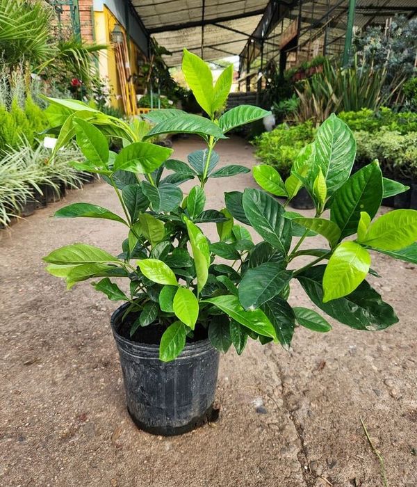 El Jazmín del Cabo es un arbusto perenne conocido por sus hojas brillantes de color verde oscuro y sus flores blancas extremadamente perfumadas. Florece durante la primavera y el verano, y puede alcanzar una altura de hasta 2 metros.